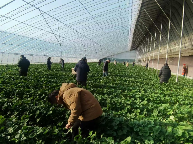 初冬时节,草莓大棚外寒风萧瑟,棚内却暖意融融,一垄垄草莓苗整齐排列,绿叶间点缀着红艳艳的果实,散发出诱人的香气。职工们手提小篮,穿梭在田垄间,细心挑选,分享采摘心得,互相交流工作和生活,欢声笑语回荡在整个大棚。